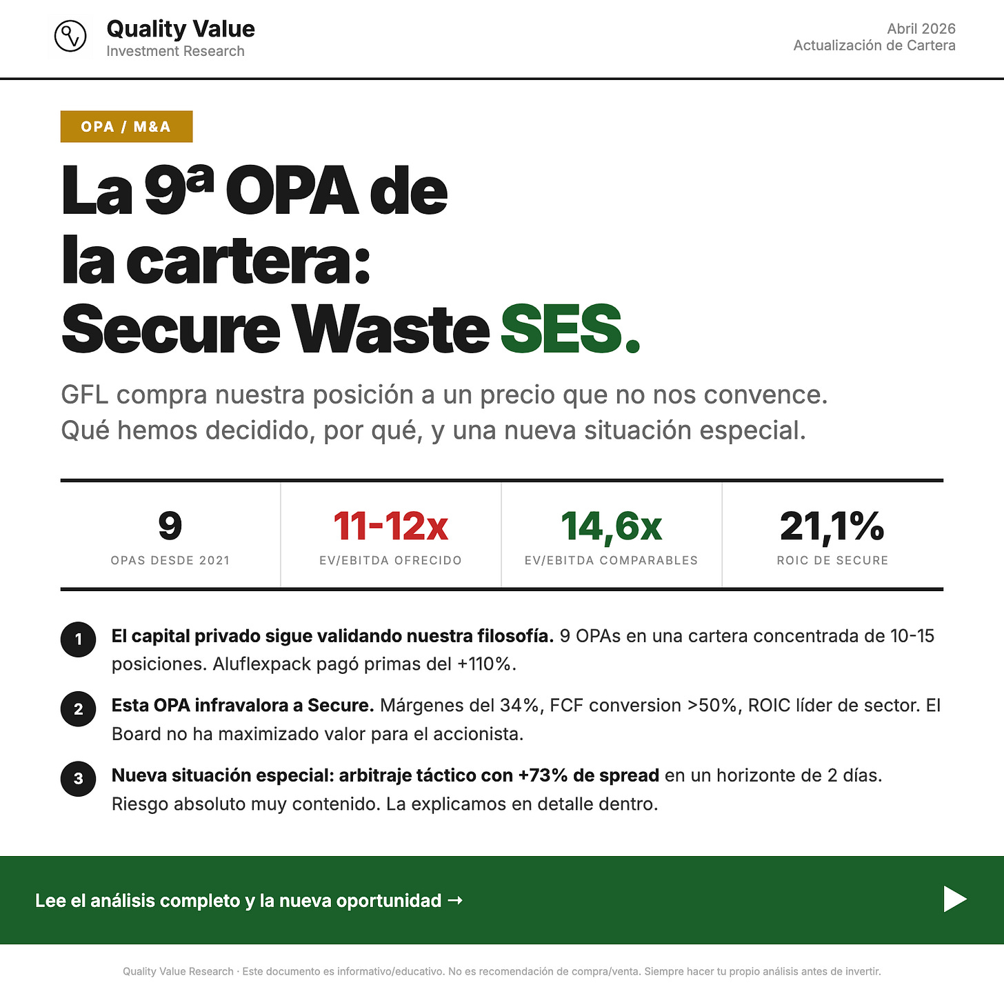 Hay que ser honestos: no todas las OPAs que recibimos son buenas. Algunas, como la de Majorel, fueron excelentes — un +43% siendo Top 3 de cartera. Esta, en cambio, nos parece insuficiente y frustrante para quien conoce el valor real de lo que tiene entre manos.