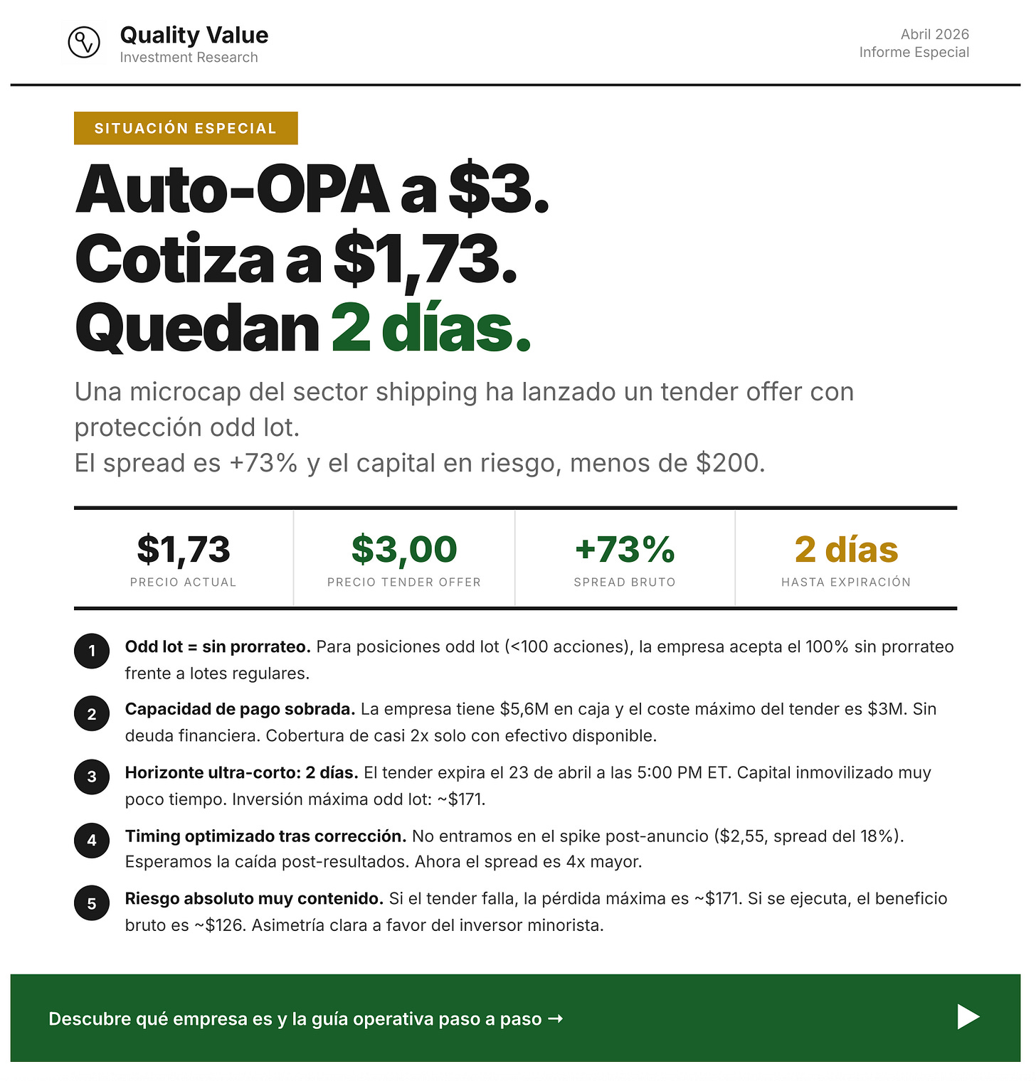 Y segundo, desvelamos una nueva situación especial en la que ya hemos invertido: una auto-OPA con protección odd-lot, con fecha límite en 2 días y un spread bruto del 73%. (*Nota: esta situación como otras parecidas, fue compartida en nuestro canal discord hace unas semanas)
