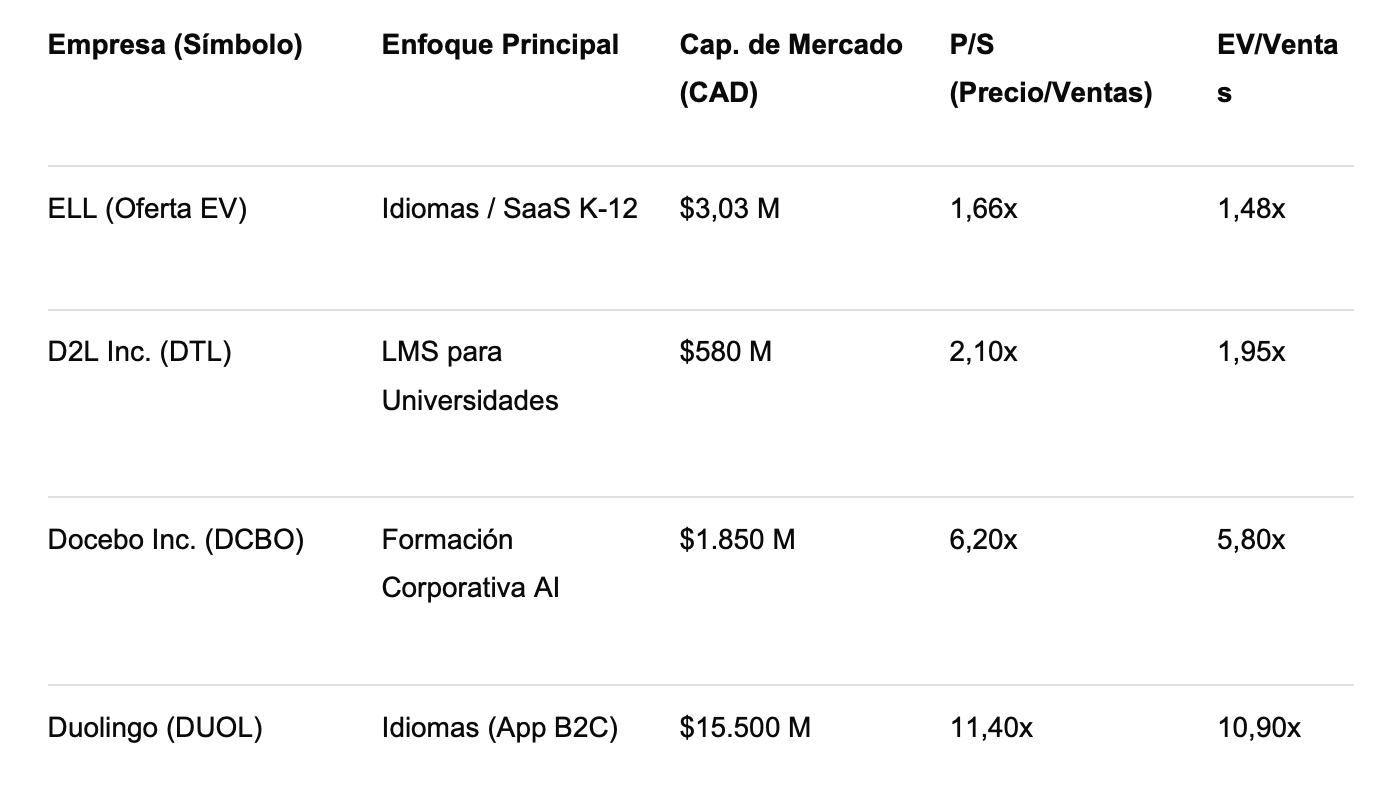 ELL (oferta): múltiplos bajos vs Docebo/Duolingo (muy altos) y similares/ligeramente inferiores a algunos players más “tradicionales”.