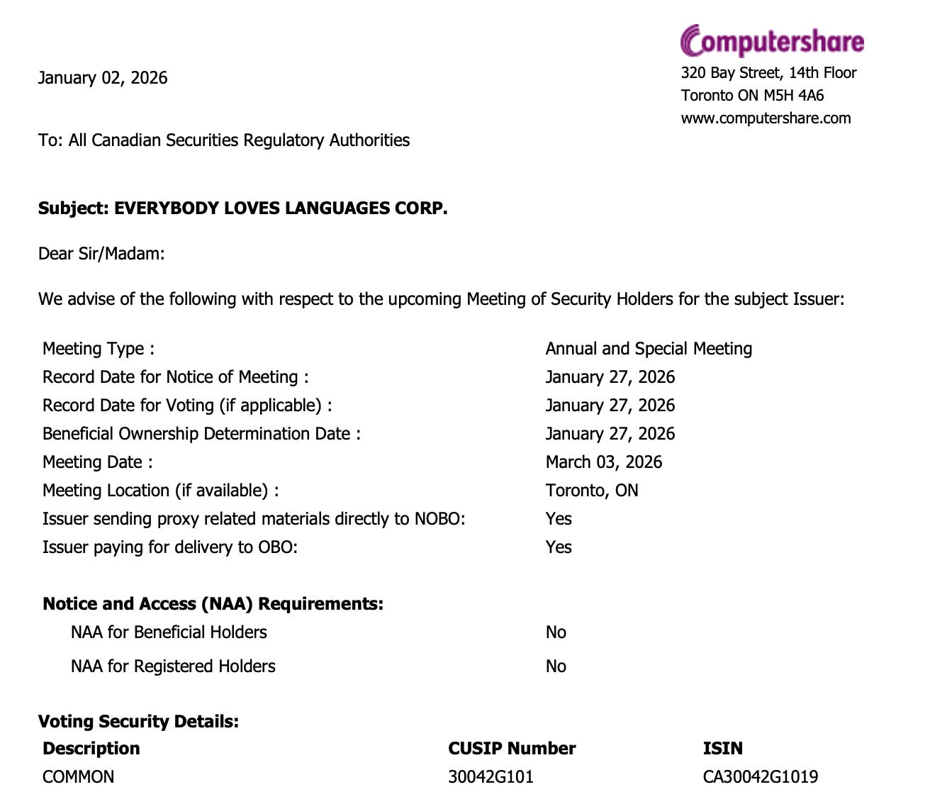 ~3 feb 2026: entrega/envío previsto de la Management Information Circular.