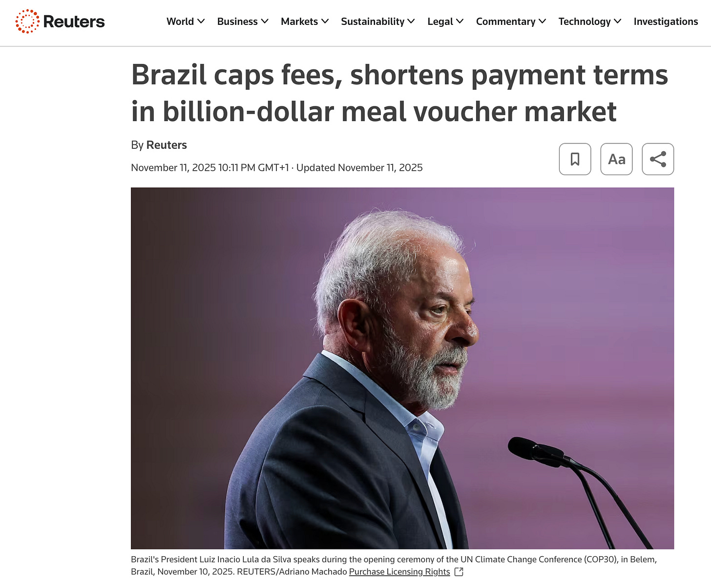 El Gobierno de Brasil ha lanzado un decreto que cambia las reglas del mercado de vales de comida (PAT). Tres medidas concentran el riesgo para los emisores: tope a la comisión que paga el comercio (MDR), plazo máximo de pago al comercio de 15 días y obligación de interoperabilidad en un año.