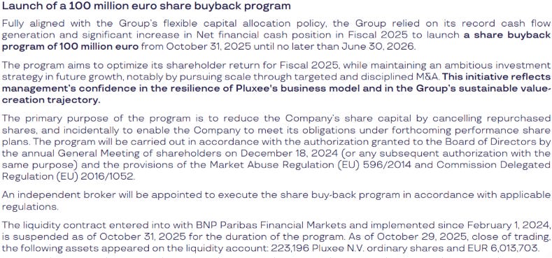 Aplicación del programa de re-compra de acciones lanzado de €100m, que estimo siendo conservador que puede re-comprar al menos 6m de acciones.