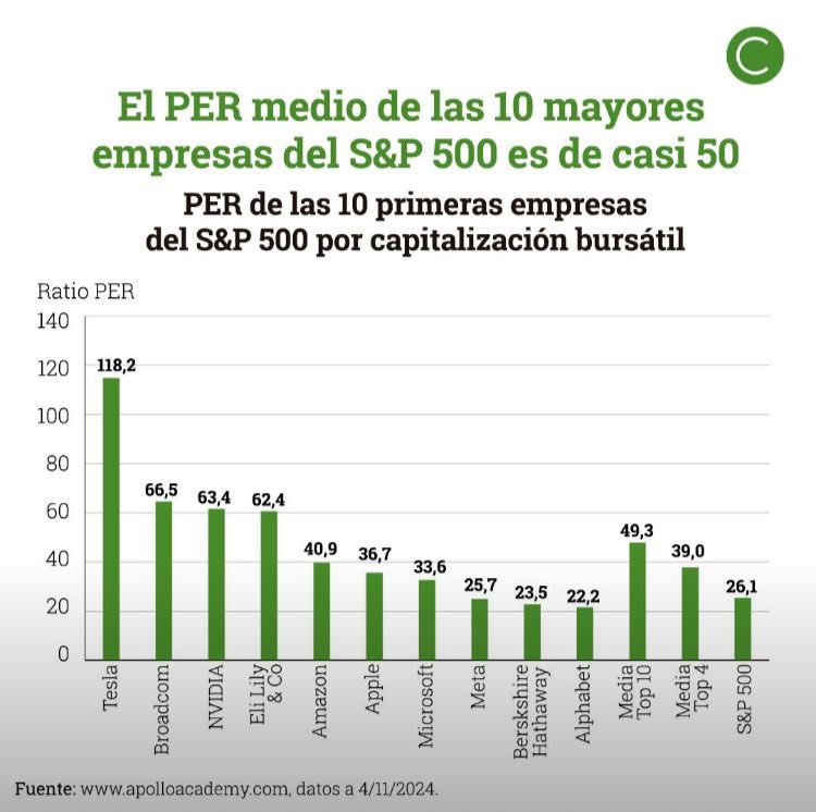 Y esto es lo que propuse en la anterior actualización de cartera a finales de 2024. Por aquella fecha estaba viendo que el S&P500 estaba caro, pero que las 10 mayores empresas que representaban casi el 40% del indice total estaban en casi 50x de PER.