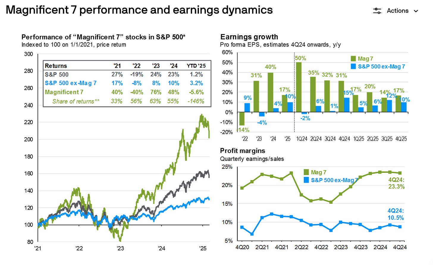 👉 ¿Que ha pasado en lo que llevamos de 2025? Que el S&P500 excluyendo las 7 empresas más grandes ha tenido un comportamiento positivo de +3,2%, mientras que incluyendo las 7 grandes solo ha obtenido un 1.2%. Mientras que si solo vemos las 7 acciones, estas han bajando un -5,6%.