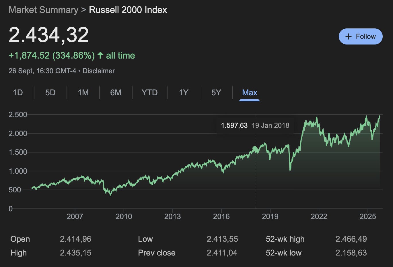 Tras casi 3 años en lateral, el Russell 2000 —referencia de small caps en EE. UU.— acaba de marcar un nuevo máximo histórico. La señal no es menor: coincide con el giro de la Fed hacia recortes de tipos y con una ampliación del rally más allá de las mega-cap.