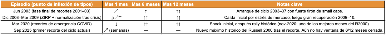 Contexto cuantitativo: análisis recientes citan que, de media, las small caps han promediado rentabilidades cercanas al 20–35% en los 12 meses posteriores a pausas/recortes de la Fed (series largas; depende de la metodología). No es garantía, pero el sesgo histórico pro-small tras recortes es real