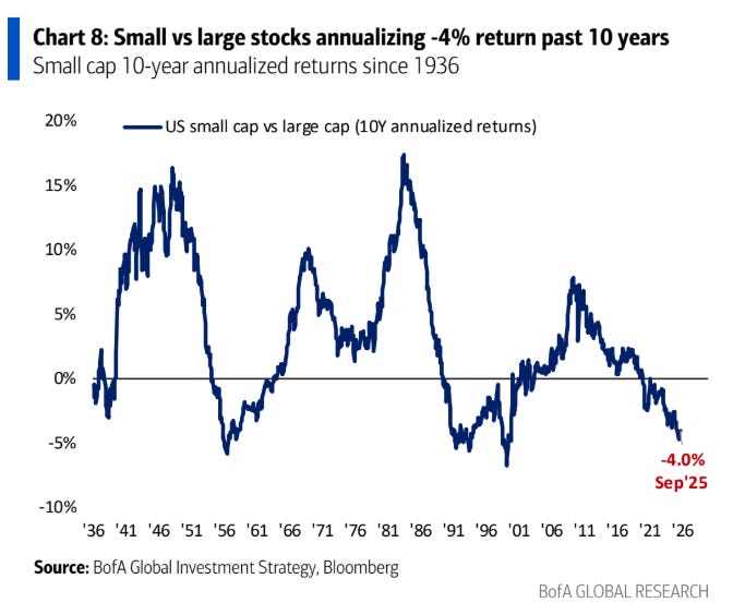 Las small caps acumulan 10 años de infrarendimiento frente a las grandes, con un diferencial histórico del –4% anual. Cada vez que esto ha ocurrido en el pasado, ha sido la antesala de un fuerte rebote. Hoy el mercado las ignora, pero ahí es donde nacen las mejores oportunidades.